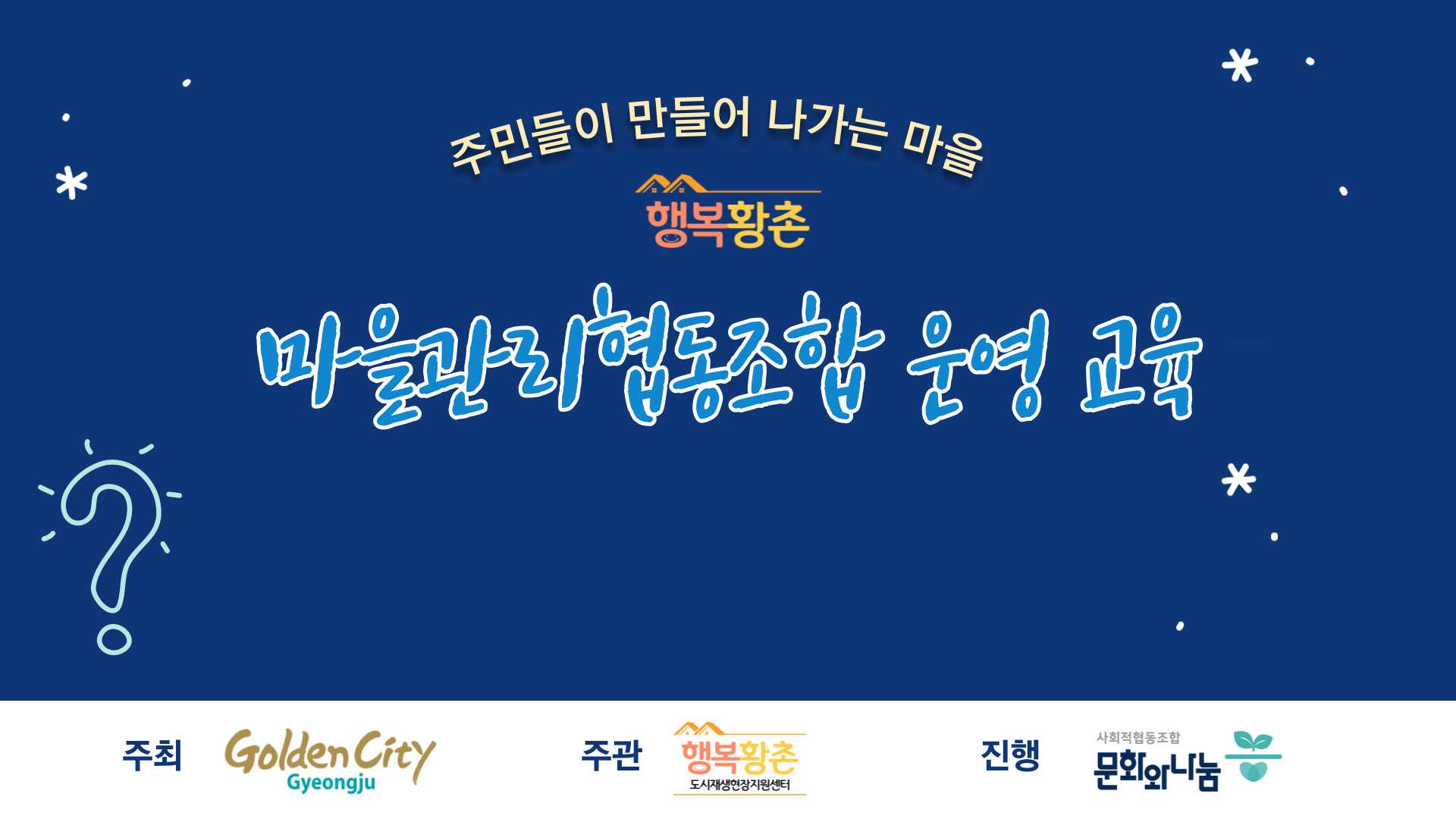 경주시에서 위탁한 2021 행복황촌 마을관리협동조합 운영교육을 지난 7월 13일부터 9월 16일까지 우리 조합이 시행하였습니다. 마을관리협동조합 운영교육은 도시재생구역으로 지정된 구역을 대상으로 마을관리협동조합을 설립하기 위한 기본적인 사항을 알려주는 교육입니다. 강의는 경주시 황오동에 있는 행복황촌 사랑채에...